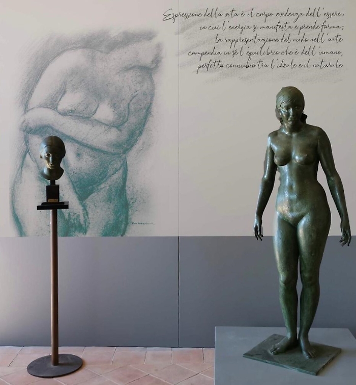 Cinquantotto le opere milanesi riunite a Taormina, grandi e piccoli bronzi che consentono di ripercorrere nella sua terra d’origine e nella luce mediterranea cara a Francesco Messina l’intero corpus della sua opera. L’esposizione è articolata in sette sale. Introdotti dal Grande Torso Femminile (bronzo, 1970), seguono sei nuclei tematici. Il primo è quello dei “Ritratti” e fra questi, algido e altero, quello della moglie Bianca Fochessati Clerici (in marmo e in ceramica policroma), dell’amico e conterraneo Salvatore Quasimodo, poeta e premio Nobel per la Letteratura, dell’attrice Anna Maria Ferrero. Quindi la sala dei “Nudi”, elogio della giovinezza e della bellezza dei corpi femminili che, di Messina, fa dire al poeta Eugenio Montale “E’ una armoniosa e ferace giovinezza la sua, che si esprime in opere di ritmo e leggiadria”. Come Eva (monumentale bronzo del 1949, alto ben 190 cm), come il Grande nudo femminile (bronzo del 1967) e come le statue di bambini e adolescenti - inverosimilmente immobili – e colti nell’espressione candida e innocente della loro tenera età; a seguire con le sale “Canone”, “Ballerine” e “Cavalli” è la celebrazione della forza impressa da Messina nella materia: dalla potenza muscolare dei pugili accovacciati, nervi e muscoli in tensione, in attesa febbrile di sferrare un nuovo attacco; alla flessuosa grazia corporea e gestuale del ciclo delle ballerine, con citazioni di grandi étoile della Scala di Milano - come Carla Fracci, Liliana Cosi e Aida Accolla - che furono sue modelle; fino all’indomita energia che emana la serie degli Stalloni: fra questi l’occhio attento del visitatore riconoscerà, in miniatura, una vera “icona” della tv di stato, quel Cavallo Morente realizzato da Messina nel 1958 per la sede Rai di Roma. Fra i modellini, in prestito dallo Studio Museo di Milano, figura a Taormina anche lo Stallone ferito, opera appartenente alla città di Catania che proprio vent’anni fa, nel 1999, dedicò a Messina la prima retrospettiva post mortem (dal 2014 collocata fra il verde di piazza Galatea, mentre più avanti in piazza Europa, rivolta al mare, si trova un’altra opera dello scultore, “La Romantica”, nella versione in marmo).