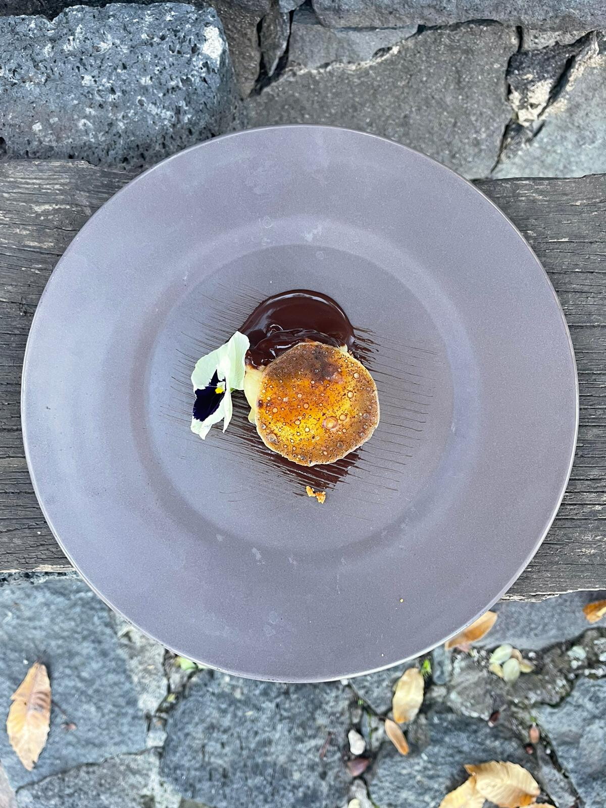 Mezza sfera di melanzana sciroppate, ricotta dolce, crumblè alla vaniglia di bourbon, dressing al cioccolato fondente e cialda di caramello e bottarga