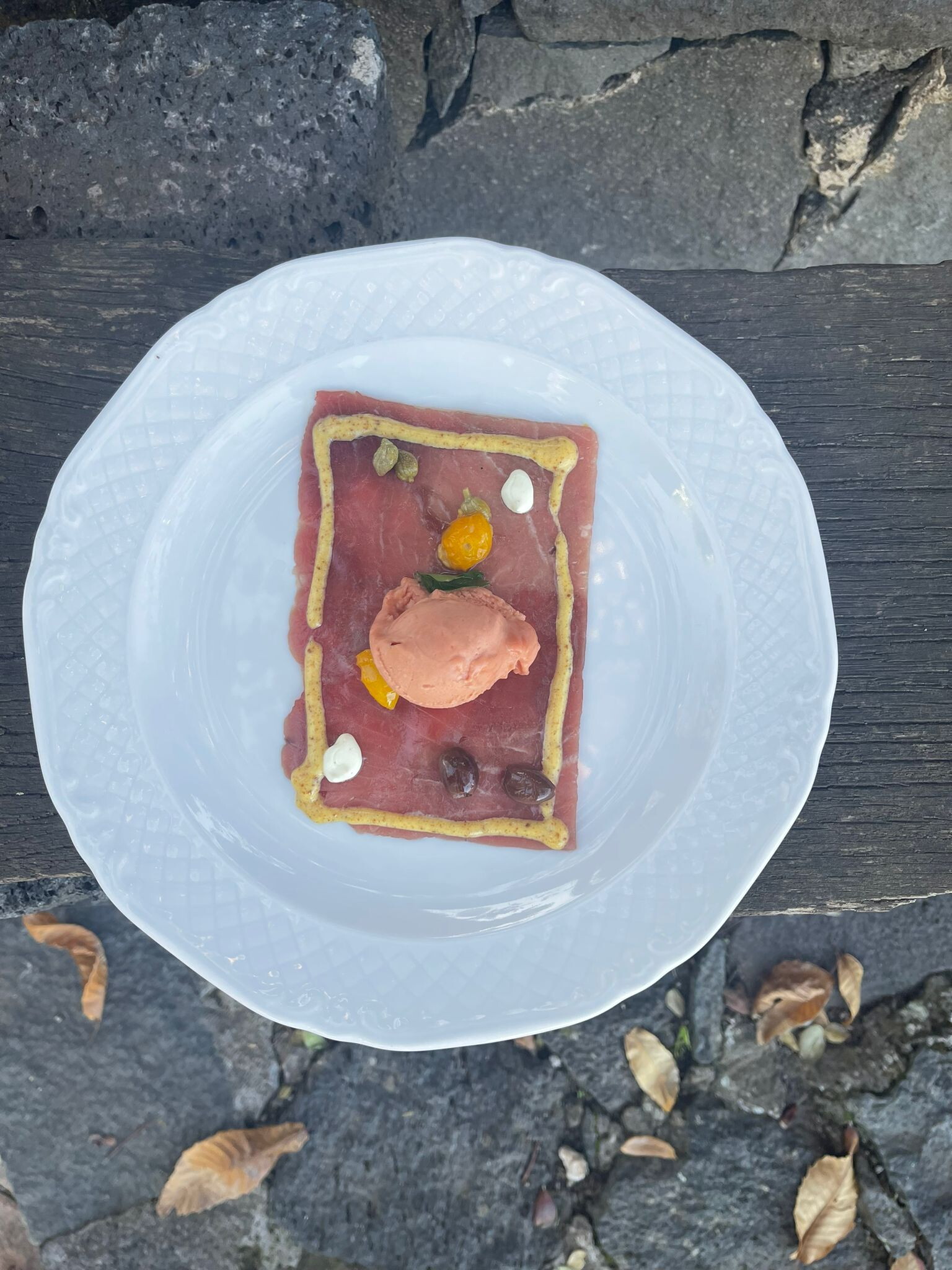 Quadro di tonno rosso, emulsione di bottarga dello stesso, capperi olive taggiasche pomodorini gialli appassiti, sorbetto al pomodoro e cipolla al vino acidulo