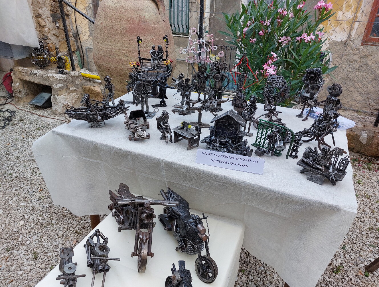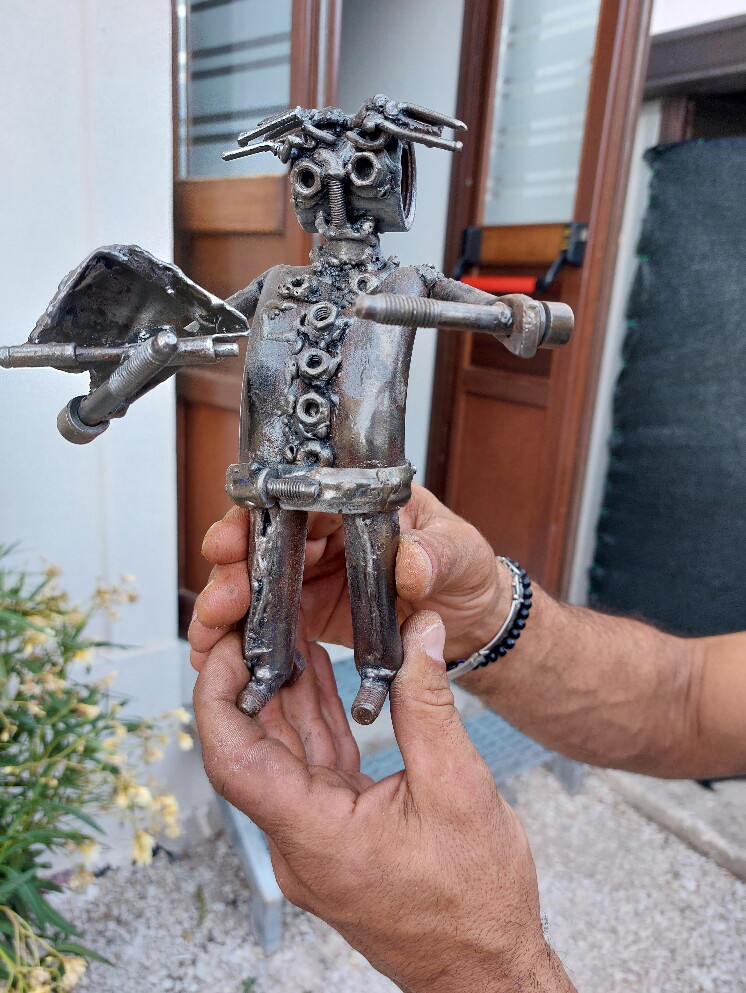 Bulloni, ammortizzatori, cuscinetti a sfera, parti di motore. Nascono così, plasmando ciò che comunemente si porta in discarica o viene raccolto da chi guadagna qualche euro con il ferro vecchio, le sculture di ferro di Giuseppe Cosentino, 38 anni, palermitano, uno che conosce bene le difficoltà della vita ma che ha trovato l’ispirazione giusta nell’arte. Giuseppe riesce a dare forma a qualsiasi tipo di oggetto in ferro, gli basta il suo fedele saldatore e un’incudine per trasformare in sculture uniche i suoi pensieri, le emozioni, i ricordi, i sogni. Il tema conduttore sono sempre i figli, 7 e 9 anni, che vivono lontani da lui. Eppure attraverso le sue opere immagina un abbraccio, una gita assieme, la loro festa di compleanno. Tutto riportato fedelmente in queste sculture create da oggetti senza più utilità ma che grazie a lui, alla sua vena artistica, trovano un’anima e riescono a trasmettere messaggi a chi le osserva.