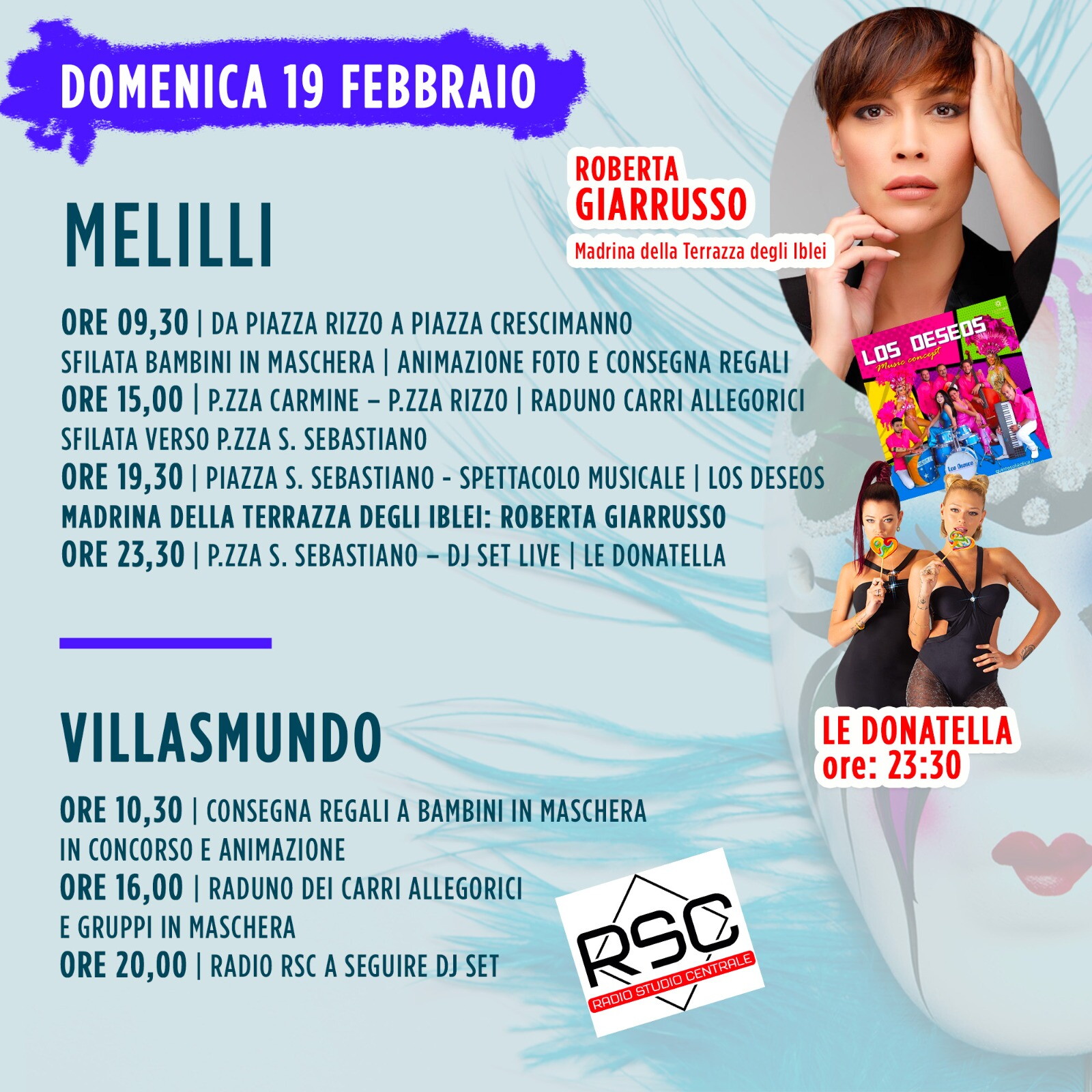 Domenica 19 è il giorno clou: a Melilli si comincia già di buon mattino con la sfilata dei bambini in maschera, nel pomeriggio la sfilata dei carri allegorici e la sera spazio allo spettacolo musicale con Los Deseos e special guest l’attrice Roberta Giarrusso, madrina della terrazza degli Iblei. A seguire si balla con Le Donatella. Un po’ quello che succede a Villasmundo: alle 10:30 animazione per i bambini in maschera, alle 16 raduno carri allegorici e gruppi in maschera e di sera ancora dj set con Radio Rsc.