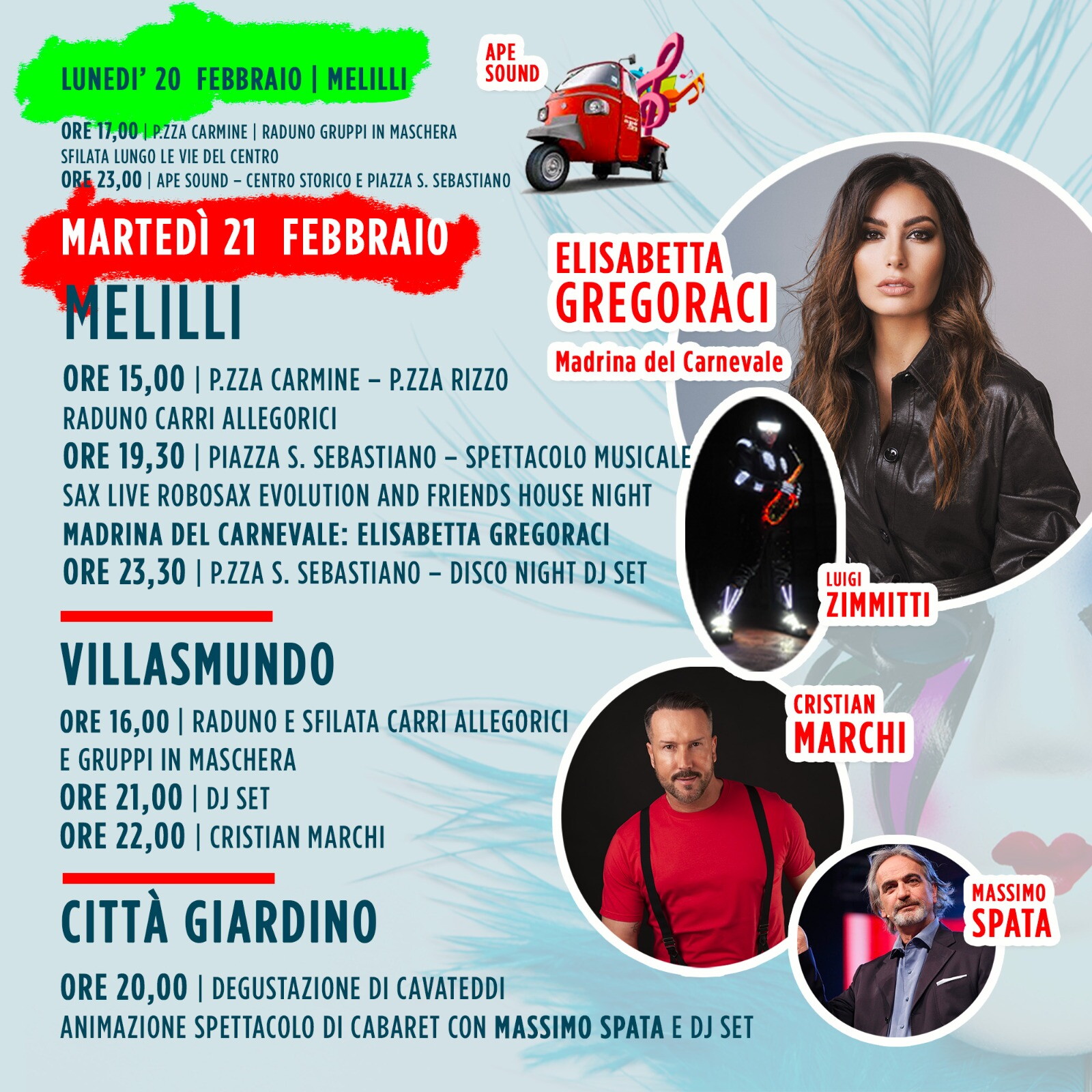 Martedì il gran finale con lo spettacolo musicale Sax Live Robosax Evolution and Friends House Night con Luigi Zimmitti, dalle 19:30, dal vivo in piazza San Sebastiano a Melilli al quale parteciperà la madrina del Carnevale, la bellissima e bravissima Elisabetta Gregoraci.