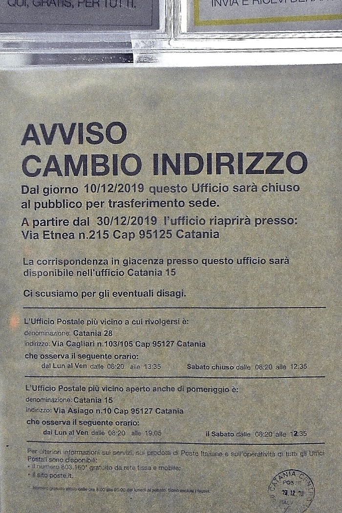 Chiude “per sempre” l’ufficio postale di viale Africa. L’avviso pubblico all’ingresso dell’Ufficio ormai deserto informa del “cambio indirizzo dal giorno 10 dicembre, per trasferimento sede. A partire dal 30 dicembre l’Ufficio riaprirà presso via Etnea n. 215”, con indicazioni sugli uffici postali più vicini a cui rivolgersi, quelli di via Cagliari 103 e via Asiago 10.