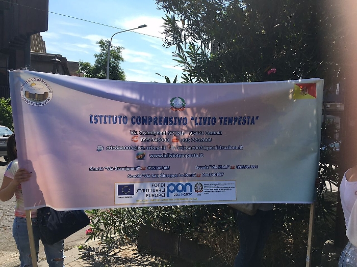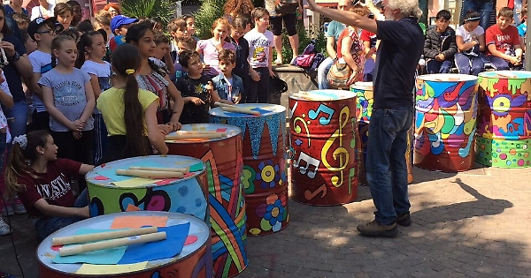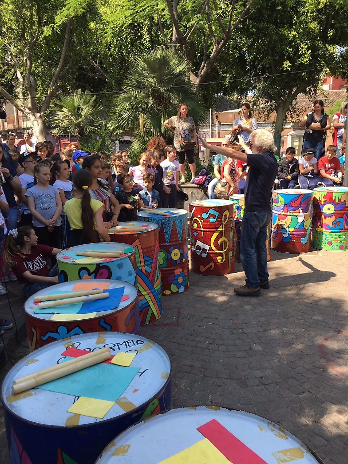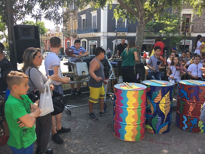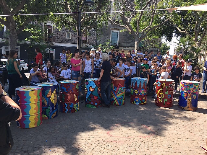 Catania - Ad una settimana di distanza dall'ennesimo raid delinquenziale che ha colpito l'Istituto Comprensivo "Livio Tempesta" ( i ladri attraverso un foro nella parete hanno portato via computer, fotocopiatrici e altro materiale didattico), oggi per la scuola "di frontiera" del Tondicello della Plaia è stata giornata di festa. Nel quadro della Settimana della Musica, promossa dal Miur, è stato infatti organizzato un concerto dell'orchestra dell'Istituto. Enormi fusti di latta allegramente colorati, sono stati trasformati in tamburi con cui i ragazzi si sono anche esibiti riportando nel quartiere un clima di festa e di serenità.
