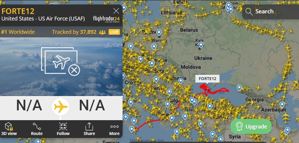 Anche stamattina di fatto l’unico velivolo, se si escludono i caccia russi, a volare sull’Ucraina è il drone Forte 12 partito da Sigonella nella notte e che sarà impegnato fino a stasera in una operazione di controllo sul Mar Nero.