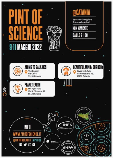Dalle nuove energie al grande osservato speciale, l’Etna; dai meccanismi di comprensione e apprendimento del nostro cervello alle stelle di neutroni. Ma anche la Via Lattea e nuove forme di comunicazione; l’antibiotico resistenza e materiali green per il restauro; e poi la pandemia e gli effetti del long Covid. Tutto questo, e molto altro, è Pint of Science Catania 2022, quinta edizione catanese della manifestazione internazionale di divulgazione scientifica, nata nel 2012 nel Regno Unito, e arrivata ad abbracciare 23 città italiane e 25 paesi nel mondo, coprendo tutti e cinque i continenti. A Catania Pint of Science è organizzato grazie al prezioso contributo del Centro Siciliano di Fisica Nucleare e di Struttura della Materia.