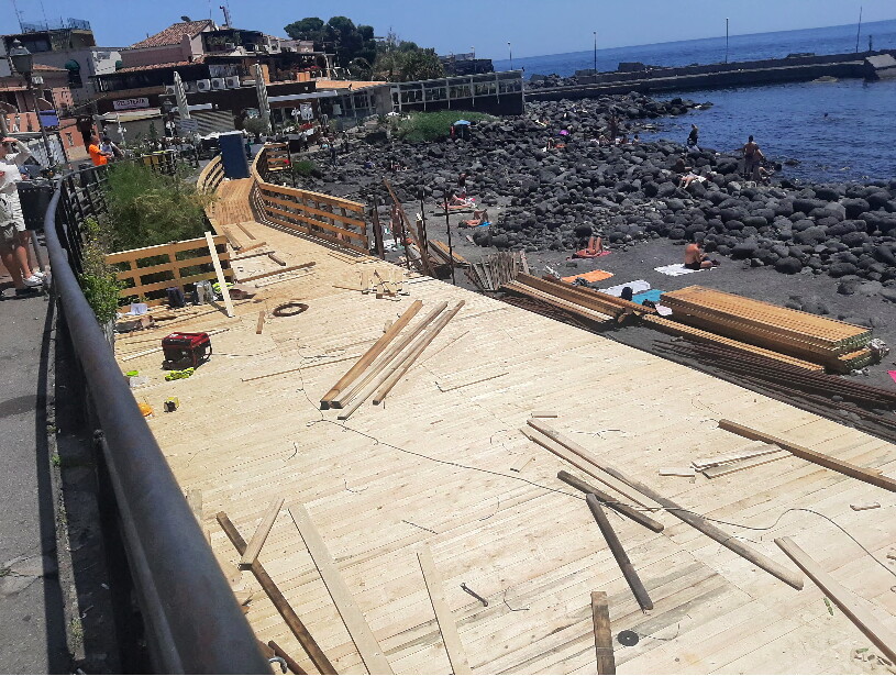I lavori a San Giovanni li Cuti sono in fase più avanzata. «La piattaforma sarà allestita un po’ più a destra per rispettare la distanza dal porticciolo - afferma l’assessore Michele Cristaldi - i lavori di carpenteria sono in fase avanzata e la struttura della scaletta d’accesso al mare è stata completata, così d’intesa con l’impresa abbiamo deciso di avviare i lavori sotto piazza Europa».