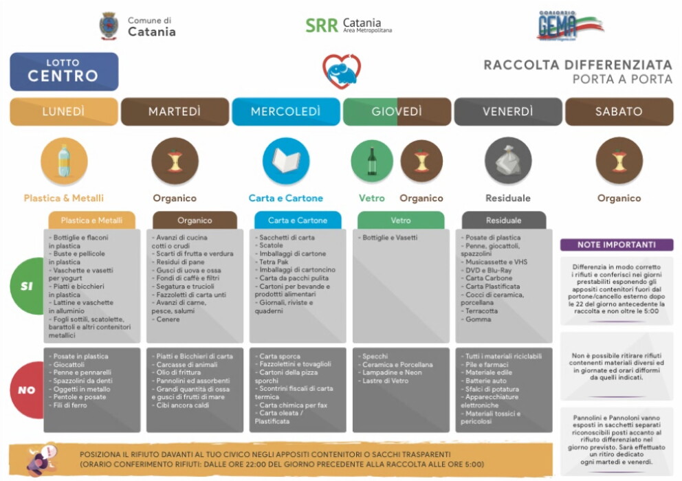 In particolare il nuovo calendario prevede la raccolta dell’organico il martedì, giovedì e sabato, della plastica il lunedì, carta e cartone il mercoledì, vetro il giovedì, e venerdì il residuale secco che, è utile ricordare, non è “buttare tutto insieme”, ma tutto ciò che non è differenziabile né riciclabile. Nel volantino vengono specificati: posate di plastica, penne, giocattoli, spazzolini, musicassette e vhs, carta carbone, carta plastificata, cocci di ceramica e porcellana, terracotta, gomma. Così come si ricorda di utilizzare gli appositi contenitori o sacchi trasparenti (no sacchi neri) e di conferire, rigorosamente, dalle 22 del giorno precedente alla raccolta alle 5 del mattino. Pannolini e pannoloni vanno esposti in sacchetti separati e riconoscibili con ritiri dedicati il martedì e venerdì. I numeri verdi per informazioni, segnalazioni, ritiro ingombranti e apparecchiature elettriche ed elettroniche sono l’800-409866 da fisso e 081-914904 da cellulare, il Centro comunale di raccolta di riferimento per il Lotto centro è in via Maria Gianni a Picanello, aperto dal lunedì al venerdì dalle 9 alle 13 e dalle 14,30 alle 18, il sabato dalle 9 alle 13.