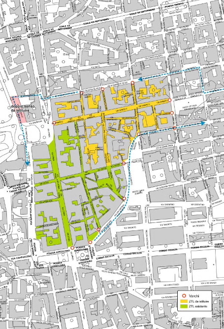 La Ztl non lascia, anzi “raddoppia”: secondo Amts è infatti «tutto pronto per l’ampliamento della zona a traffico limitato “Centro storico” anche in via Umberto e dintorni. Manca solo l’ok finale del Comune». In particolare su via Umberto si parla di circa 300 metri, quelli compresi tra via Etnea e via Guglielmo Oberdan. Dopo l’introduzione dei cordoli per il passaggio del Brt5 (dalla stazione al Cannizzaro), una sorta di “elimina doppia e tripla fila” che sembra stia funzionando, è la mappa che pubblichiamo che mostra come a dare ancora più ordine e controllo saranno gli otto varchi elettronici previsti in via Umberto proprio all’incrocio con le vie Etnea e Oberdan, in via Grotte Bianche all’altezza di piazza Carlo Alberto e via De Felice, all’incrocio tra via Capuana e via Vanasco, tra via Giardini e via Oberdan e tra via De Felice e le vie Amantea e Agnini.