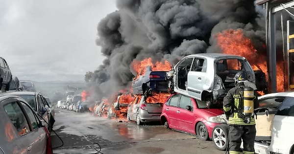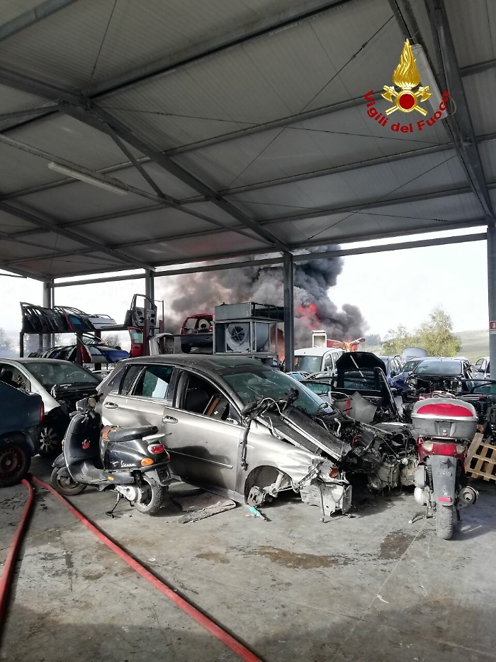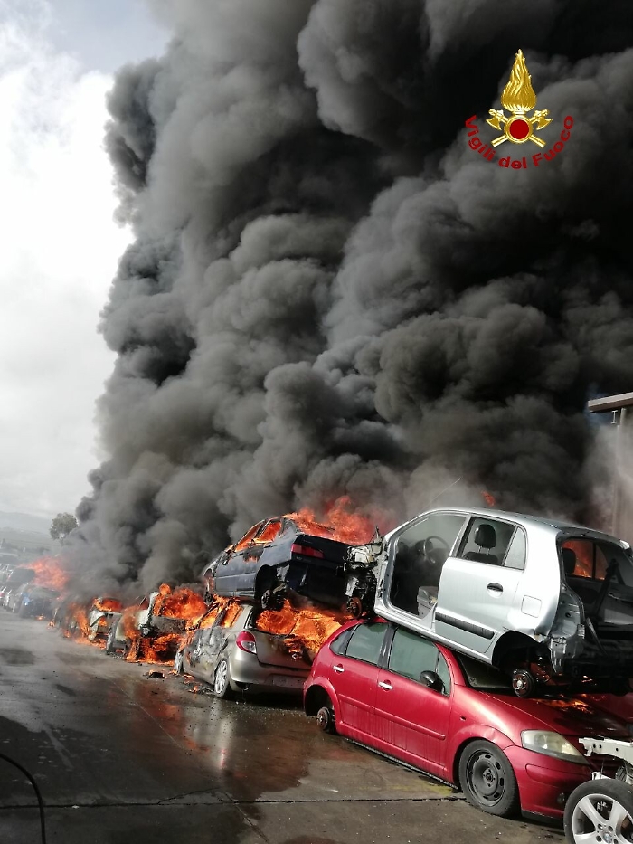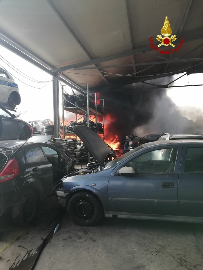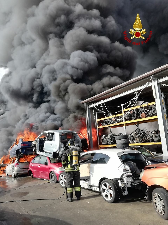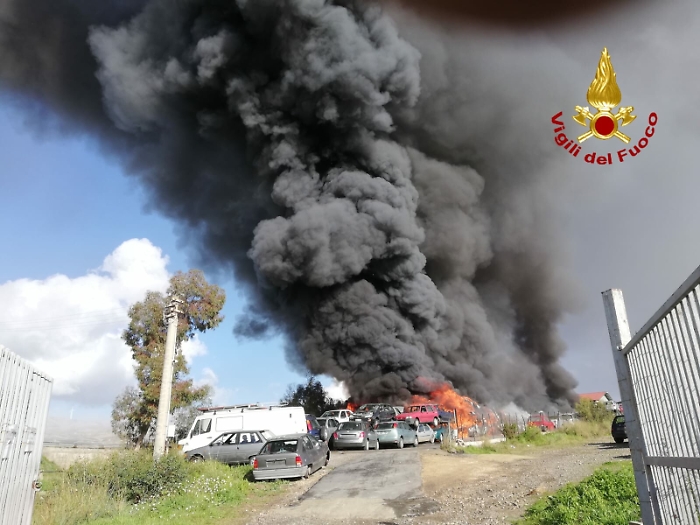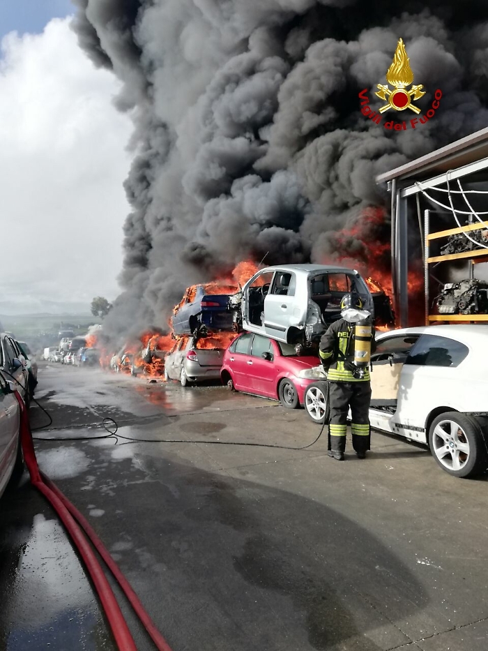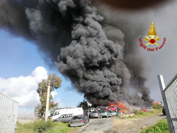 MINEO (Catania) - Un vasto incendio è divampato poco prima delle 10 di oggi in un deposito di autodemolizioni, con all’interno un centinaio di autovetture, di contrada Terre Salse in territorio di Mineo, nel Catanese. A dare l’allarme sono stati diversi automobilisti che hanno notato una alta colonna di denso fumo nero levarsi dalla struttura che si vedeva dalla strada statale Catania-Gela.