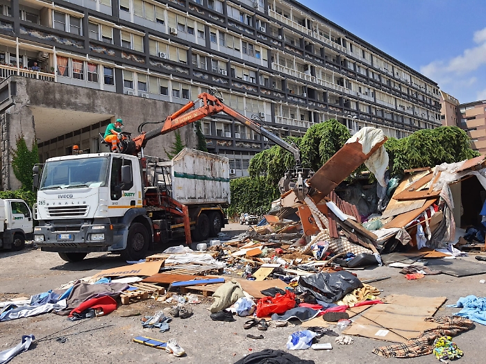 A seguito dell’ordinanza del sindaco Salvo Pogliese dello scorso 17 giugno, a cui è seguita una costante azione di convincimento delle assistenti sociali comunali e dei volontari del presidio leggero a lasciare l’area malsana, stamattina la polizia municipale, con il supporto di carabinieri, guardia di finanza e polizia di Stato, ha guidato lo sgombero di circa otto tonnellate di rifiuti e masserizie.
