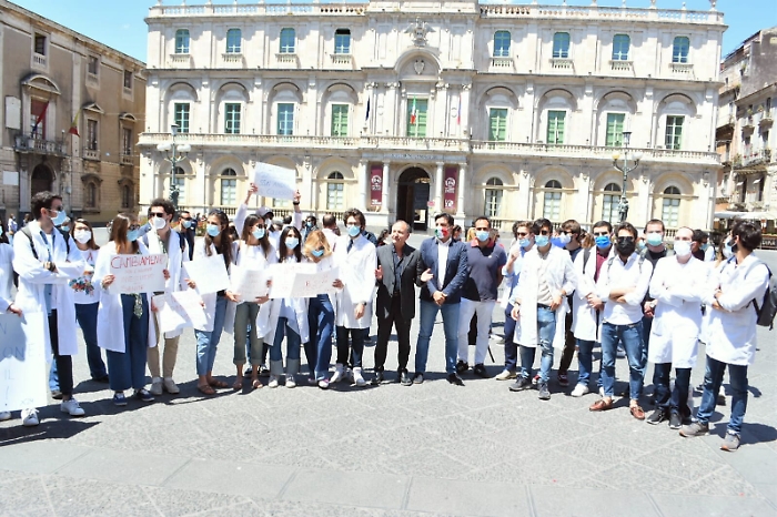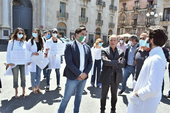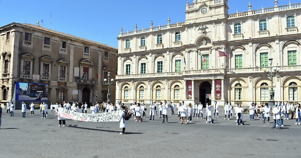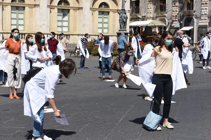Catania - Anche a Catania, e precisamente in piazza Università, i giovani medici stamane hanno manifestato con un flash mob a sostegno del futuro del Sistema Sanitario Nazionale, fortemente colpito dall'emergenza Coronavirus.La riforma del Sistema Sanitario e la formazione post-laurea tra le richieste dei manifestanti che sono stati raggiunti in piazza dal sindaco di Catania Salvo Pogliese.