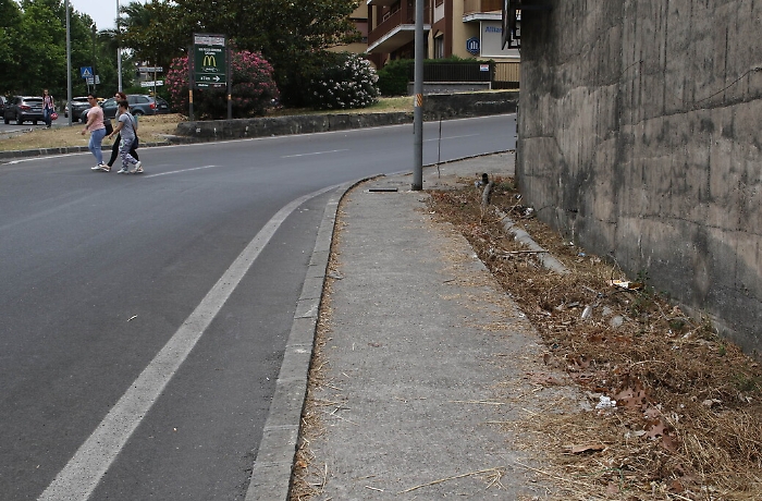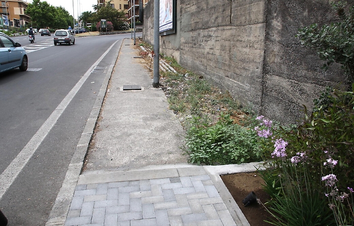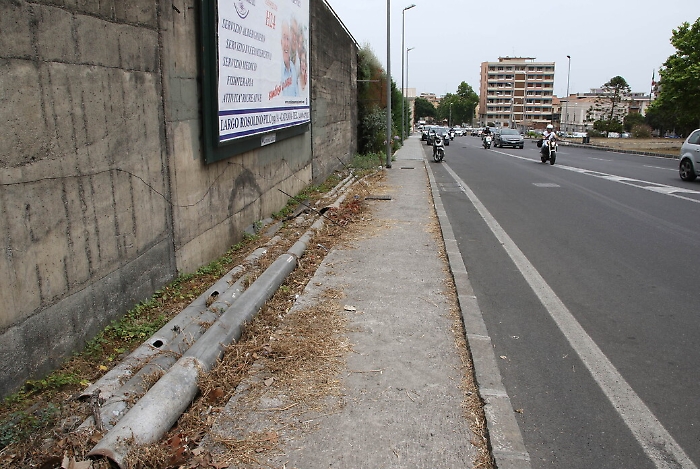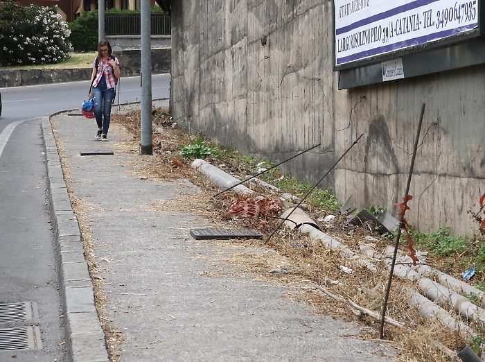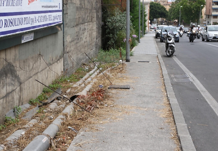Può piacere o meno la nuova fontana di via Etnea, ma va riconosciuto che rispetto al muraglione di cemento che c'era prima è un miglioramento. E poi di notte, tutta illuminata, fa un certo effetto. Il problema è che si tratta della classica "cattedrale nel deserto". Tutto intorno alla luccicante fontana infatti l'abbandono è totale. Nelle aiuole della rotonda al centro del nodo Gioeni non c'è infatti un filo di verde pubblico, i rifiuti fanno bella mostra tra le poche piante spontanee che crescono nella sciara, tubi spaccati emergono dai muri residui del vecchio Tondo Gioeni, cordoli divelti in mezzo alla strada. Per non parlare dei marciapiedi che scorrono dallo stesso lato della fontana. Sterpaglie, sporcizia, niente pavimentazione, tondini di ferro di vecchi lavori murari che emergono dal terreno mettendo a rischio anche l'incolumità dei passanti.
