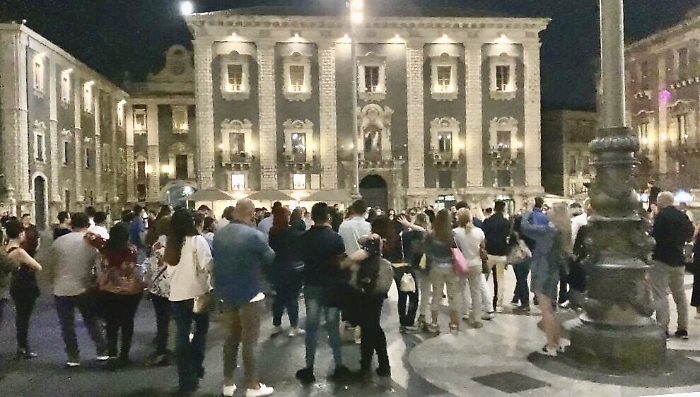 Un signore sta parlando al telefono, è senza mascherina. Ci guarda, gli facciamo un segno interrogativo eloquente, la sua risposta con la mano lo è altrettanto, fatevi i fatti vostri. Un pullman di turisti si ferma in piazza Stesicoro, saranno una trentina. Sono tedeschi. Le mascherine le hanno, ma non tutte coprono naso e bocca e, soprattutto, camminano in gruppo, forse troppo vicini. L'autista allarga le braccia, «le raccomandazioni vengono date, non siamo mica poliziotti».