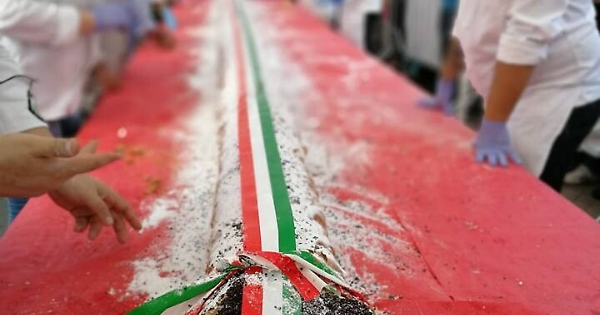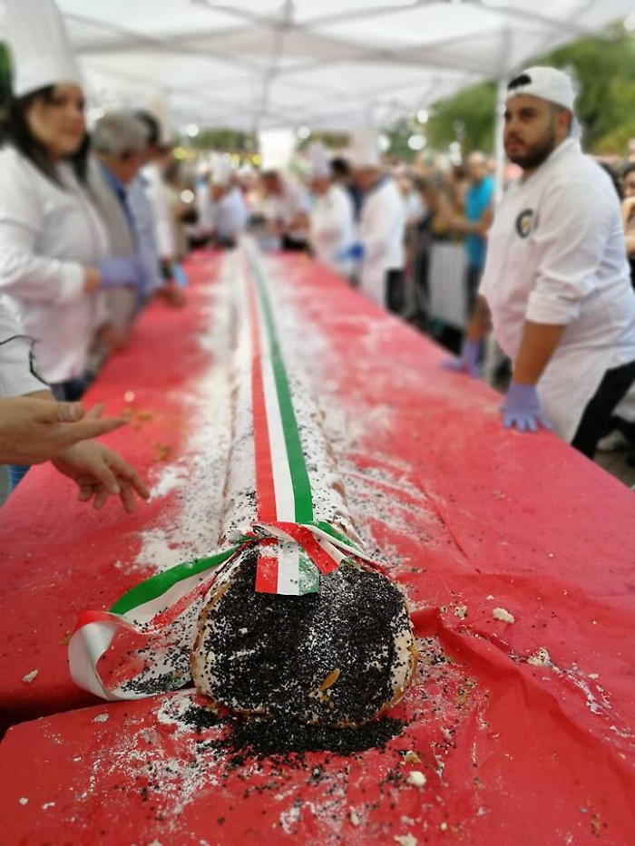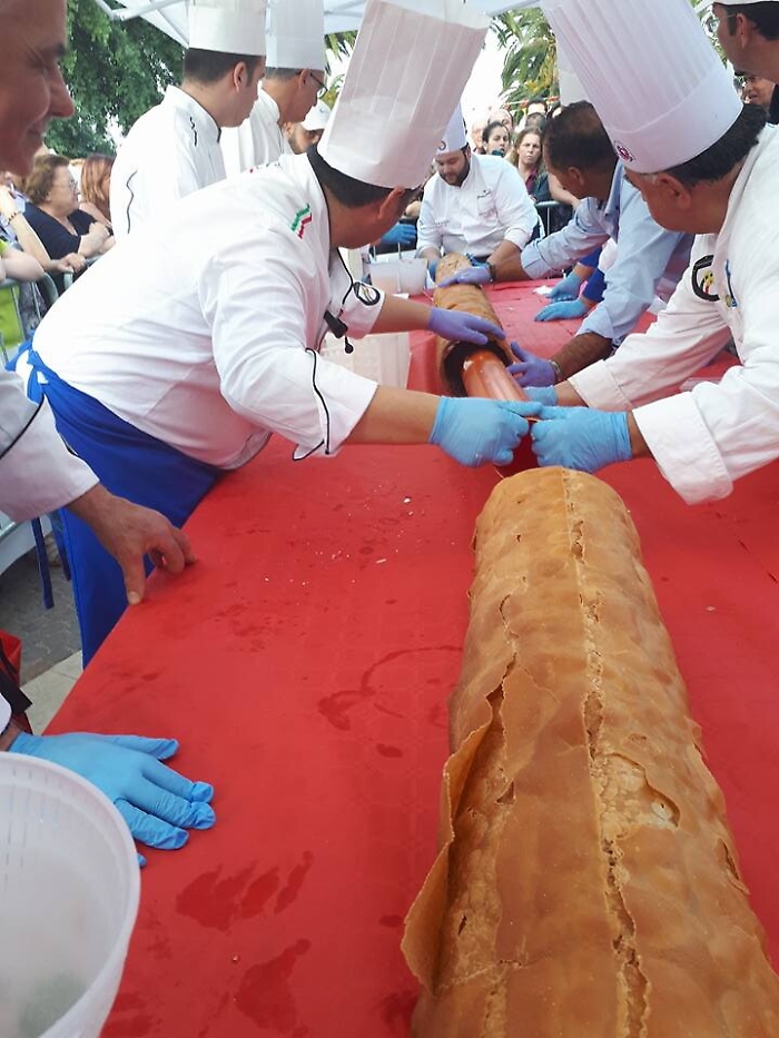 ACI BONACCORSI - È record mondiale: realizzato ieri un grande cannolo di 7,69 metri di lunghezza, un diametro di 25 centimetri e un peso di 135 chilogrammi, farcito all’interno di ricotta e gocce di pistacchio all’esterno, il tutto opera di pasticceri qualificati. Detenere un record è il sogno di molti e anche un piccolo Comune dell’hinterland catanese è riuscito nell’impresa festeggiando l’evento in grande stile: Aci Bonaccorsi, ieri pomeriggio lo ha raggiunto l’obbiettivo, ratificato da una giuria specializzata, con il Guinness World Records 2018, fresco di lancio, ricco di storie, passioni e “manie” difficili da eguagliare. L’evento è stato organizzato nella centralissima piazza della Regione, dai volontari della Fratres della sezione di Aci Bonaccorsi e dall’associazione “Stella dei Venti” con il patrocinio del Comune.