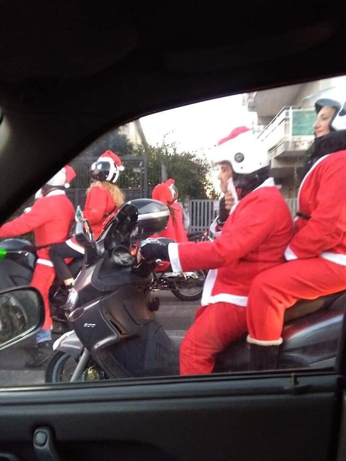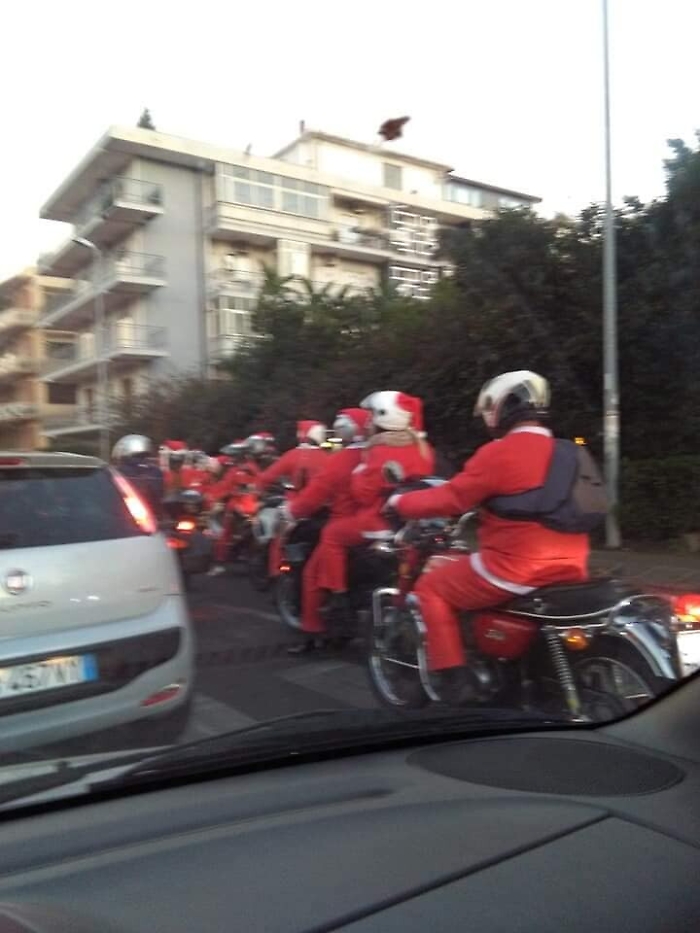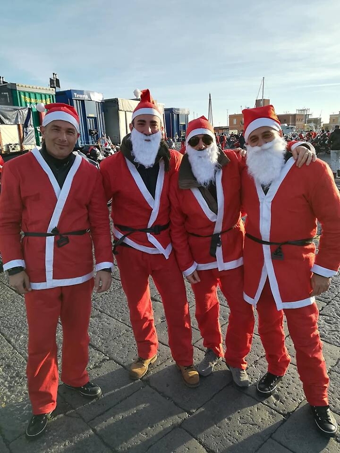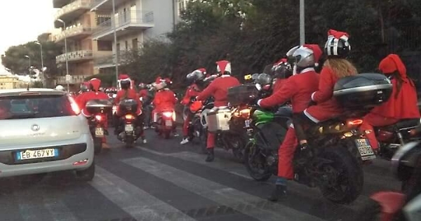 Catania - Sono partiti dal porto di Catania e in sella alle loro moto hanno attraversato gran parte della città. E' diventata una piacevole tradizione quella di scaldare i motori in questo periodo natalizio, per i tanti motociclisti che, arrivando anche da fuori Sicilia, aderiscono al Motogiro di Babbo Natale. Una passeggiata in moto, indossando la "divisa" di Babbo Natale, che ha un fine benefico: quello di raccogliere alimenti da donare alla Casa della Carità.