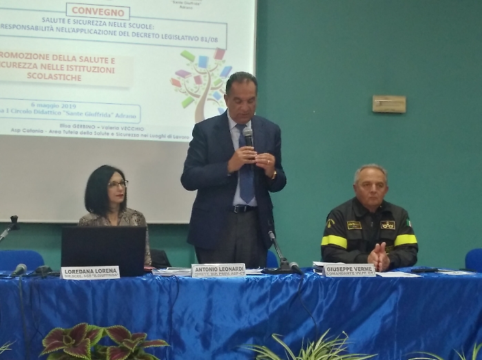 ADRANO (Catania)- Leggi. Guarda. Ascolta. Scrivi. Quattro parole e quattro step per utilizzare al meglio il “Quaderno Operativo” sulla sicurezza destinato ai docenti-formatori e agli studenti. Il Quaderno, ideato e realizzato grazie all’impegno delle ingegneri Elisa Gerbino e Valeria Vecchio dell’Area Tutela e Sicurezza del Dipartimento di Prevenzione dell’Asp di Catania, diretto dall’ing. Antonio Leonardi, è stato presentato stamattina nell’Aula Magna del I C.D. Sante Giuffrida di Adrano, in occasione del convegno dal titolo “Salute e Sicurezza nelle Scuole: ruoli e responsabilità nell’applicazione del Decreto legislativo 81/08” organizzato con la “Rete Obiettivo Sicurezza”. Una mattinata con poche chiacchiere e molti aspetti tecnici durante la quale si sono succeduti, al tavolo dei relatori, esponenti di rilievo nel settore della sicurezza: l’ing. Antonio Leonardi direttore del Dipartimento di Prevenzione dell’ASP di Catania; il comandante provinciale dei Vigili del Fuoco, Giuseppe Verme; il dirigente della Protezione Civile, Francesco Impellizzeri; Santo De Luca, resp. U.O. di Controllo e Vigilanza - SPREASAL ASP CT; Salvatore Lizzio e Salvatore Benedetto, resp. U.O. Sicurezza Macchine e Impianti e U.O. Controllo Combustione SIA ASP CT; Maurizio Caltabiano, RSPP I.T.S. Pietro Branchina.