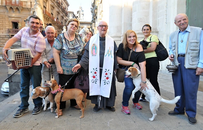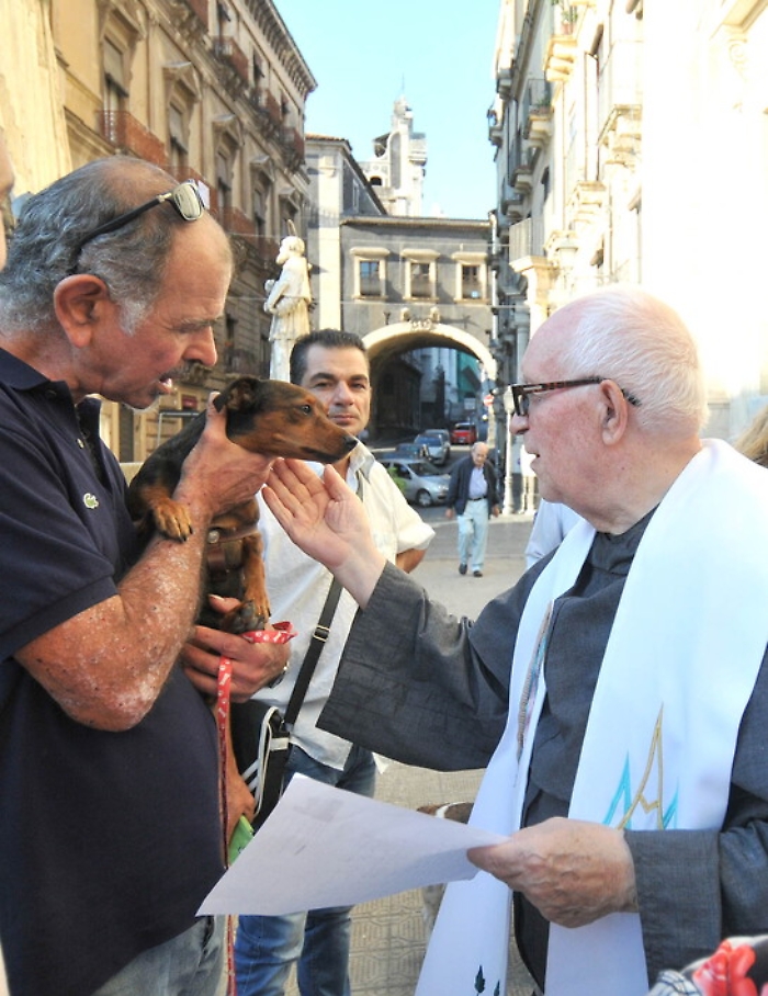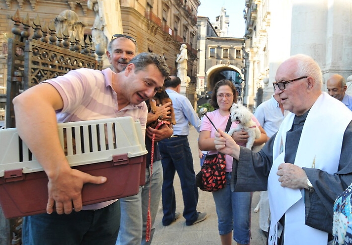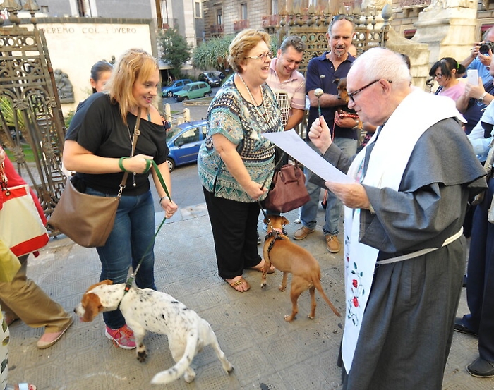 Catania - Anche quest'anno in occasione della festa di San Francesco d'Assisi a Catania, i padroni di cani e gatti si sono dati appuntamento nel Santuario San Francesco all'Immacolata per la benedizione agli animali. Padre Mario Gaudio e il rettore Rosario Buccheri hanno impartito la benedizione agli amici a quattro zampe che numerosi si sono presentati per l'atteso momento.