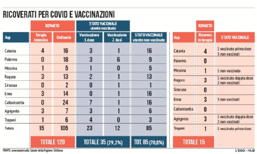 Oltre il 70%. Precisamente il 70,8%. Che rappresenta la quota di non vaccinati (in tutto 85) sui 120 ricoverati Covid in Sicilia.