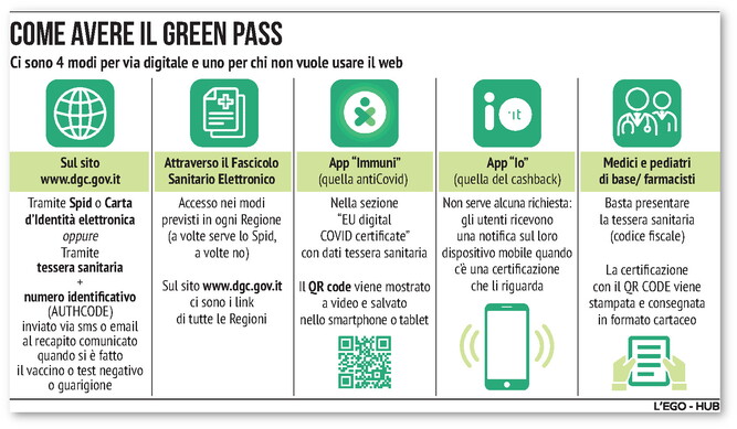 Il Green pass si ottiene con la prima dose di vaccino, con tampone rapido fatto nelle 48 ore precedenti. Per chi sia guarito dal Covid è in vigore per sei mesi dopo la guarigione.