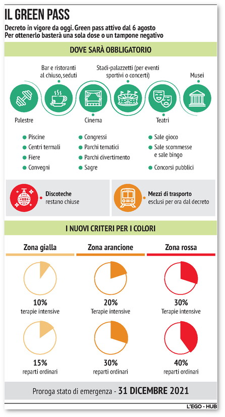 OBBLIGO DI GREEN PASS - Scatterà dal 6 agosto l’obbligo di Green pass per accedere a una serie di servizi e attività non essenziali. I prossimi quindici giorni sono un tempo fissato per consentire a chi non l’ha ancora fatto di vaccinarsi e alle attività coinvolte dall’introduzione dell’obbligo di organizzarsi. Il certificato servirà per le consumazioni al tavolo al chiuso in ristoranti e bar, dove non sarà invece necessario per il servizio al bancone. Servirà inoltre per spettacoli aperti al pubblico, eventi e competizioni sportivi; musei, luoghi della cultura e mostre; piscine, centri natatori, palestre, sport di squadra, centri benessere, anche all’interno di strutture ricettive, solo a chiuso; centri culturali, centri sociali e ricreativi al chiuso; sagre e fiere, convegni e congressi; centri termali, parchi tematici e di divertimento; attività di sale gioco, sale scommesse, sale bingo e casinò, concorsi pubblici. Sono esclusi dal Green pass i centri educativi per l'infanzia, i centri estivi e le relative attività di ristorazione.