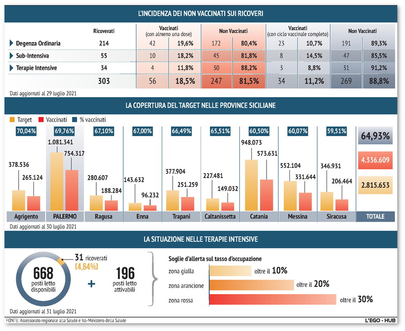 L’assessore regionale alla Salute sa bene che i due temi sono correlati. Tanto più che dai reparti, al di là del tasso di occupazione, arriva un’altra matrice di dati. Forse la più preoccupante, seppur non inedita (La Sicilia ha già fornito il dettaglio aggiornato al 23 luglio) e comunque in linea con il trend nazionale. «In questo momento - dettaglia Razza - in Sicilia oltre l’80% della popolazione ospedalizzata non si è sottoposta nemmeno a un ciclo di vaccinazione». Leggendo il dettaglio del nuovo report dell’assessorato i numeri sono anche più emblematici. Ad esempio: su una base di 303 ricoverati, appena l’11,2% risulta aver concluso il ciclo vaccinale. E, considerando soltanto i 34 in terapia intensiva, il quadro è ancora più chiaro: soltanto 4 con la prima dose e 3 immunizzati, il resto sono di fatto tutti “no vax”.