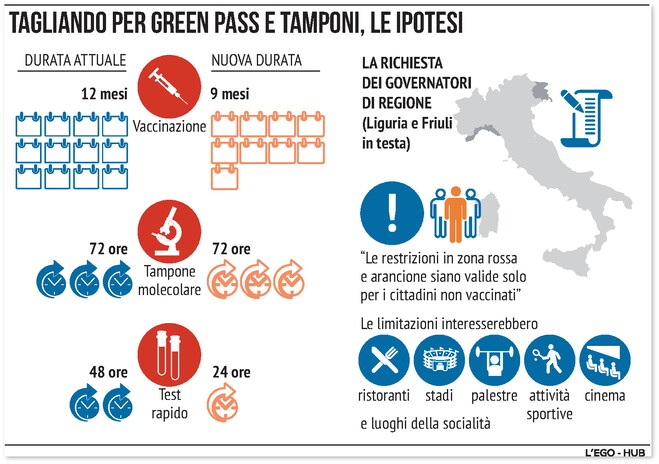 Il provvedimento che sta prendendo corpo prevede che le misure restrittive, a prescindere dal colore della regione, non si applichino a chi si è sottoposto alla vaccinazione. A questi sarà garantita la possibilità di continuare a svolgere le attività altrimenti vietate. Con il tampone sarà consentito solo andare al lavoro. Per svolgere le attività vietate nella specifica zona, bisognerà essere o vaccinati o guariti, probabilmente anche in zona bianca anche se sembra prevalere l'ipotesi di metterlo in atto solo se una regione passa in arancione o in rosso, che prevede l’obbligo di chiusure e limitazioni. In quel caso ci sarebbero corsie preferenziali per i vaccinati che potrebbero continuare a frequentare i luoghi di socializzazione, come teatri, cinema o ristoranti, contrariamente ai no vax.