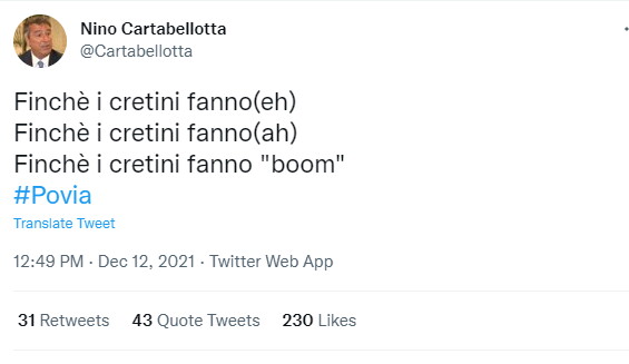 Lunga scia di polemiche sui social dopo l’annuncio di Giuseppe Povia, che, risultato positivo al covid, ha dovuto rinunciare ad una manifestazione contro il Green pass in programma a Genova. A scatenare la bagarre è stato un intervento del presidente del Gimbe, Nino Cartabellotta, che ora su Twitter parla di «un attacco squadrista di giornalisti e politici - avvezzi a lisciare il pelo ai #novax - che ti scatena addosso insulti e minacce di morte». Dopo l’annuncio del cantante, il medico ha postato questo tweet, riprendendo una parte del brano di Povia "Quando i bambini fanno oh": «Finché i cretini fanno(eh). Finché i cretini fanno(ah). Finché i cretini fanno «boom» #Povia».