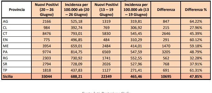 Nella settimana tra il 20 e il 26 giugno i casi di covid in Sicilia sono cresciuti del 47,8%.