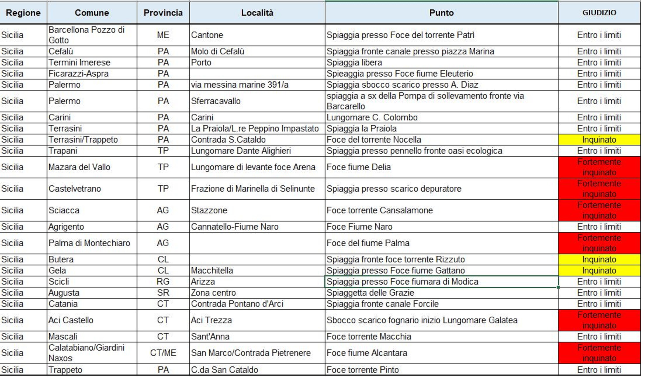 Come detto sono 9 i campioni risultati oltre i limiti di legge, si tratta sia di foci di fiumi sia punti a mare in spiagge potenzialmente frequentate dai bagnanti ignari delle acque con parametri non a norma. Andando nel dettaglio degli esiti delle analisi diffusi da Legambiente, 6 punti sono stati giudicati fortemente inquinati: sono la foce del fiume Delia a Mazara del Vallo (Trapani), la foce del torrente Cansalamone nel comune di Sciacca (Agrigento), la foce del fiume Palma nel Comune di Palma di Montechiaro (Agrigento), lo scarico dei reflui fognari sul lungomare Galatea ad Aci Trezza nel comune di Aci Castello (Catania) e la foce del fiume Alcantara tra i comuni di Calatabiano e Giardini Naxos (Catania/Messina) e la spiaggia presso lo scarico del depuratore a Castelvetrano. Gli altri 3 punti giudicati invece Inquinati da Goletta verde sono la foce del Nocella tra Terrasini e Trappeto a Palermo, la spiaggia presso il torrente Rizzuto a Butera (Caltanissetta) e la spiaggia presso la foce del Gattano a Gela (Caltanissetta).