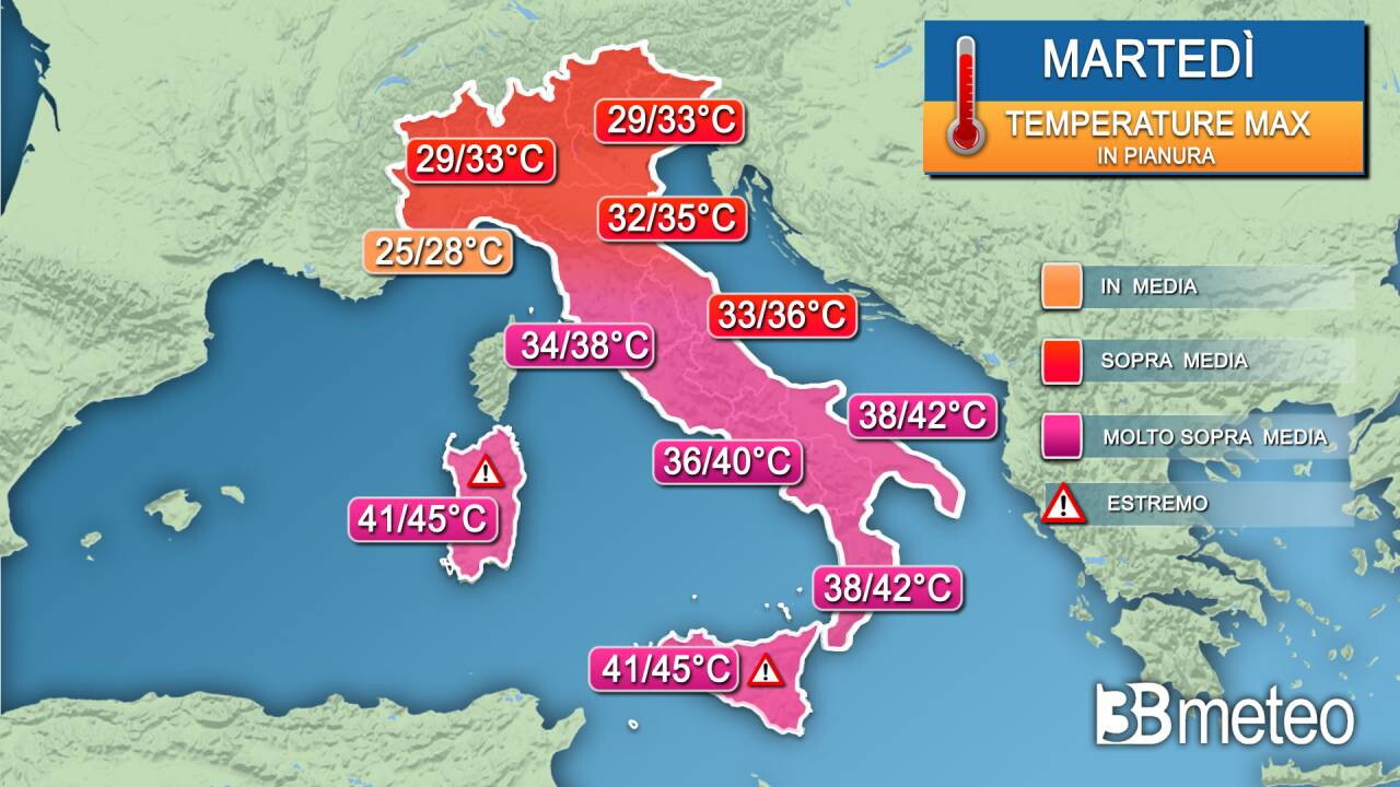 In questi giorni un po' tutta l'Italia sarà sotto la canicola africana, ma sarà appunto al Sud che il caldo risulterà a tratti estremo - avverte Edoardo Ferrara di 3bmeteo.com -, in particolare su zone interne di Sicilia e Sardegna, dove si potranno raggiungere picchi di 43-45°C. Tra le città più roventi in Sicilia figurano Palermo (che sarà da bollino rosso anche giovedì ), Catania, Siracusa e Agrigento.
