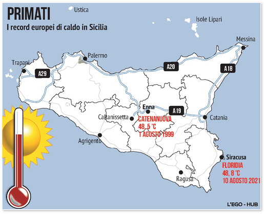 Iri la colonnina di mercurio avrebbe come detto nel siracusano, in particolare in Contrada Monastero il termometro ha segnato 48,8 gradi e, se il dato sarà validato dopo le opportune analisi, potrà diventare la temperatura più alta mai registrata nel vecchio continente. «Il dato, se confermato, potrà battere il precedente record di 48 gradi misurato ad Atene il 10 luglio 1977, superando addirittura il primato di 48.5°C fatto segnare da una stazione non ufficiale a Catenanuova nell’agosto 1999», afferma il meteorologo di 3bmeteo.com Manuel Mazzoleni. E sempre in Sicilia oggi ieri stati toccati 47.4 gradi a Paternò, 45.4 a Francofonte, 45.2 ad Aragona e 46 a Mineo.
