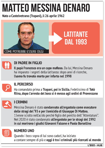 Messina Denaro è il boss del mistero ricercato in tutto il mondo per associazione mafiosa, omicidio, strage, devastazione, detenzione e porto di materie esplodenti, furto. Imprendibile perché ha goduto di una fitta rete di protezione nel trapanese anche grazie all'enorme disponibilità di soldi, un reticolo di connivenze composto soprattutto da suoi familiari più stretti e da quelli acquisiti che sono caduti via via come birilli travolti dalle inchieste giudiziarie. Ma di lui nessuna traccia. C'è chi dice sia a Dubai, o in Marocco, o che sia appunto sempre rimasto in Sicilia, ma c'è anche chi sostiene che possa essere morto.