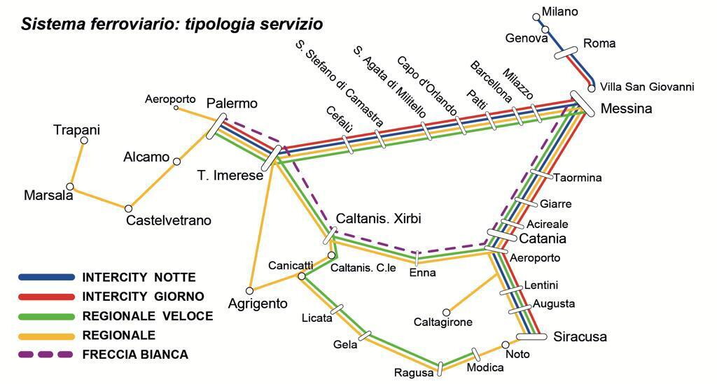 I nuovo collegamento ferroviario tra Palermo e Messina, con fermate a Caltanissetta, Enna e Catania. Treni da 200 km/h, ma soltanto in teoria