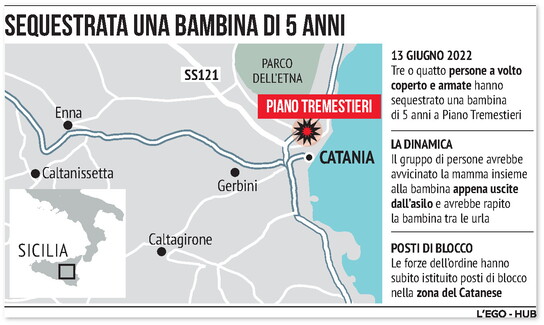 Ore d'ansia nel Catanese per una bambina di 5 anni di Mascalucia sequestrata oggi a Piano Tremestieri, frazione del comune di Tremestieri etneo. La notizia è diventata immediatamente virale sui social. La bambina secondo quanto si è appreso e secondo quanto si legge in diversi post su Internet sarebbe stata caricata in auto da un gruppo di tre uomini incappucciati che l'avrebbero portata via alla madre e si sarebbero immediatamente dileguati. Nessuno sarebbe però riuscito ad annotare modello e numero di targa dell'auto.