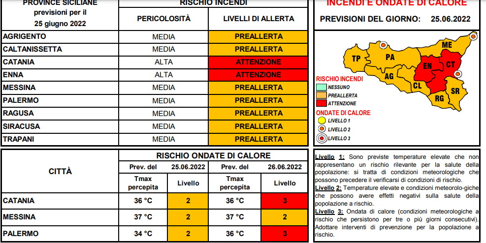 Il dipartimento della Protezione Civile della Regione siciliana ha intanto diffuso per la giornata di oggi un bollettino di rischio incendi e ondate di calore che riguarda tutta l'isola con un livello di allerta 1; entrando nel dettaglio il bollino è rosso per Catania e Enna riguardo al rischio incendi, mentre per il caldo l'allerta è rossa sempre per Catania e per Palermo.