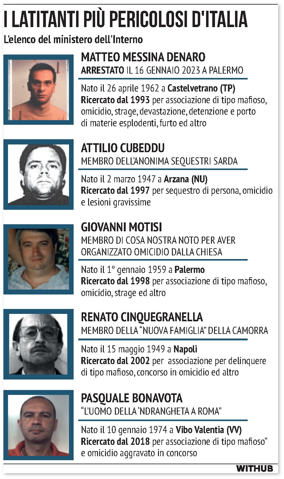 Nell'elenco del Ministero restano un esponente dell'Anonima Sequestri, il boss palermitano e altri due capi della camorra e della nadrangheta