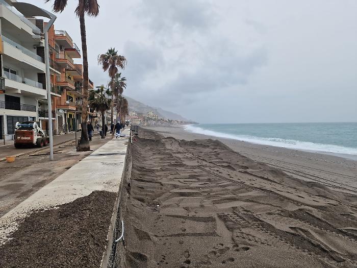 Ruspe in spiaggia, transenne, autorità e operai a Letojanni