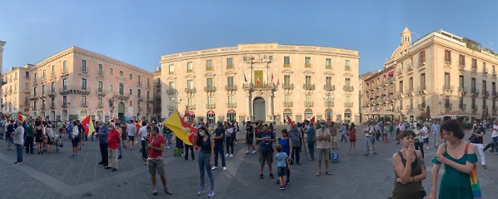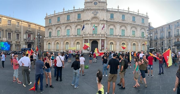 centinaia di persone hanno partecipato oggi in Piazza dell'Università, a Catania, al sit in di protesta contro l’assegnazione dell’assessorato ai Beni Culturali e all'identità siciliana alla Lega Nord da parte del presidente Nello Musumeci.