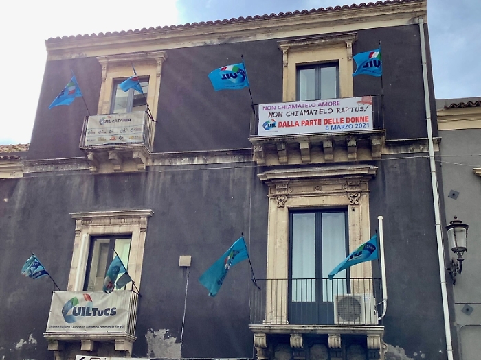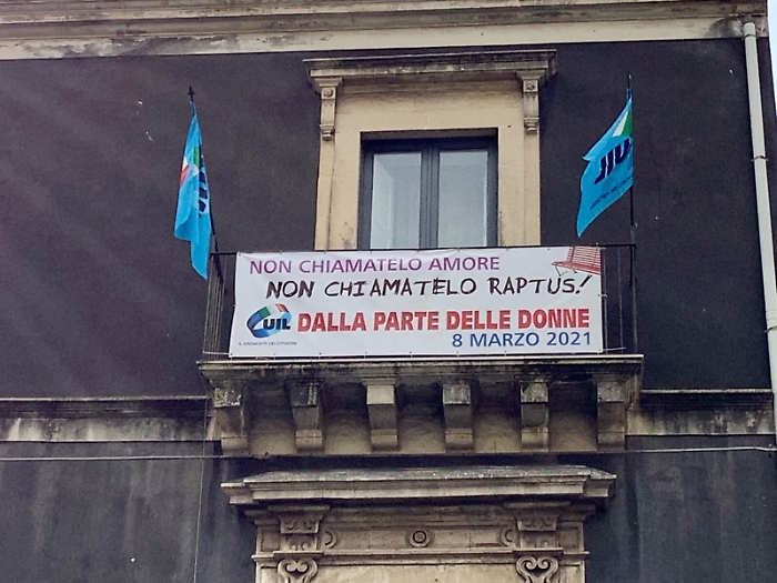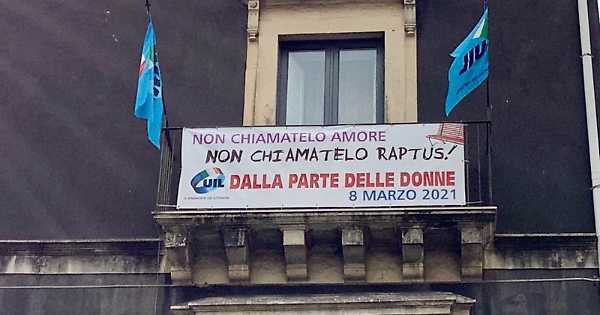 Una Giornata della Donna che non può dirsi Festa alla luce dei numeri e delle statistiche sui femminicidi spaventosi. «Non chiamatelo amore. Non chiamatelo raptus!» si legge su uno striscione che campeggia sui balconi della Uil su via Sangiuliano a Catania. Uno striscione che ricorda come la Giornata della Donna, di lunedì non possa dirsi festa:  «C’è davvero poco da celebrare – spiega la segretaria generale dell’organizzazione sindacale etnea, Enza Meli – perché sono ancora tante, troppe, le vittime di abusi e discriminazioni, mobbing e stalking, maltrattamenti e femminicidi. La pandemia ha peraltro esasperato questa inaccettabile condizione, soprattutto tra le mura di casa dove bisognerebbe invece sentirsi protette e volute bene».