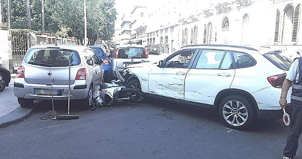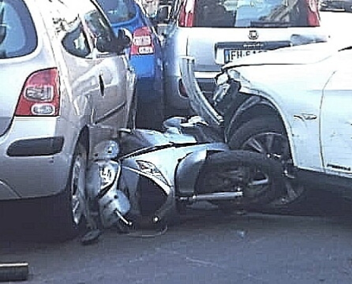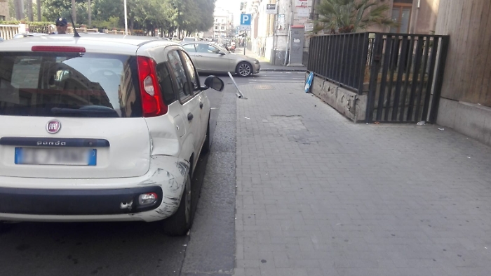 CATANIA - Rocambolesco incidente stradale questa mattina a Catania in via Francesco Crispi nei pressi della Pretura. Il conducente di una Bmw station wagon bianca ha perso il controllo del suo mezzo per cause ancora da accertare e ha travolto auto e pedoni che si trovavano sulla strada. L'auto  ha sbandato, ha colpito due auto in sosta sul lato destro della carreggiata, ha sfiorato due pedoni (che sono rimasti lievemente feriti), quindi ha divelto la segnaletica stradale, ha travolto uno scooter parcheggiato oltre l'incrocio e ha fermato la sua corsa sula lato sinistro della carreggiata andato a urtare e danneggiare altri veicoli parcheggiati.