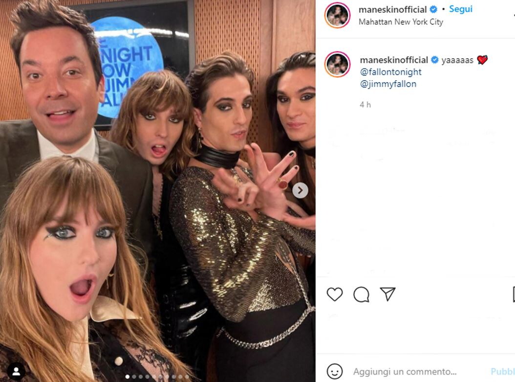 Fallon ha introdotto la band: "State pronti,  preparatevi a non togliervi i pantaloni, arrivano dall'Italia, hanno vinto l'Eurovision che è una specie di America's got talent ma più grande". I Maneskin hanno anche cantato Mammamia, il loro ultimo brano. E hanno poi approfittato per dare l'incredibile annuncio della loro presenza al prossimo live dei Rolling Stones. La leggendaria formazione di "(I can't get no) Satisfaction» si esibirà il prossimo 6 novembre all’Allegiant Stadium di Las Vegas e per l’occasione Mick Jagger e soci hanno scelto come artista d’apertura proprio i Maneskin.
