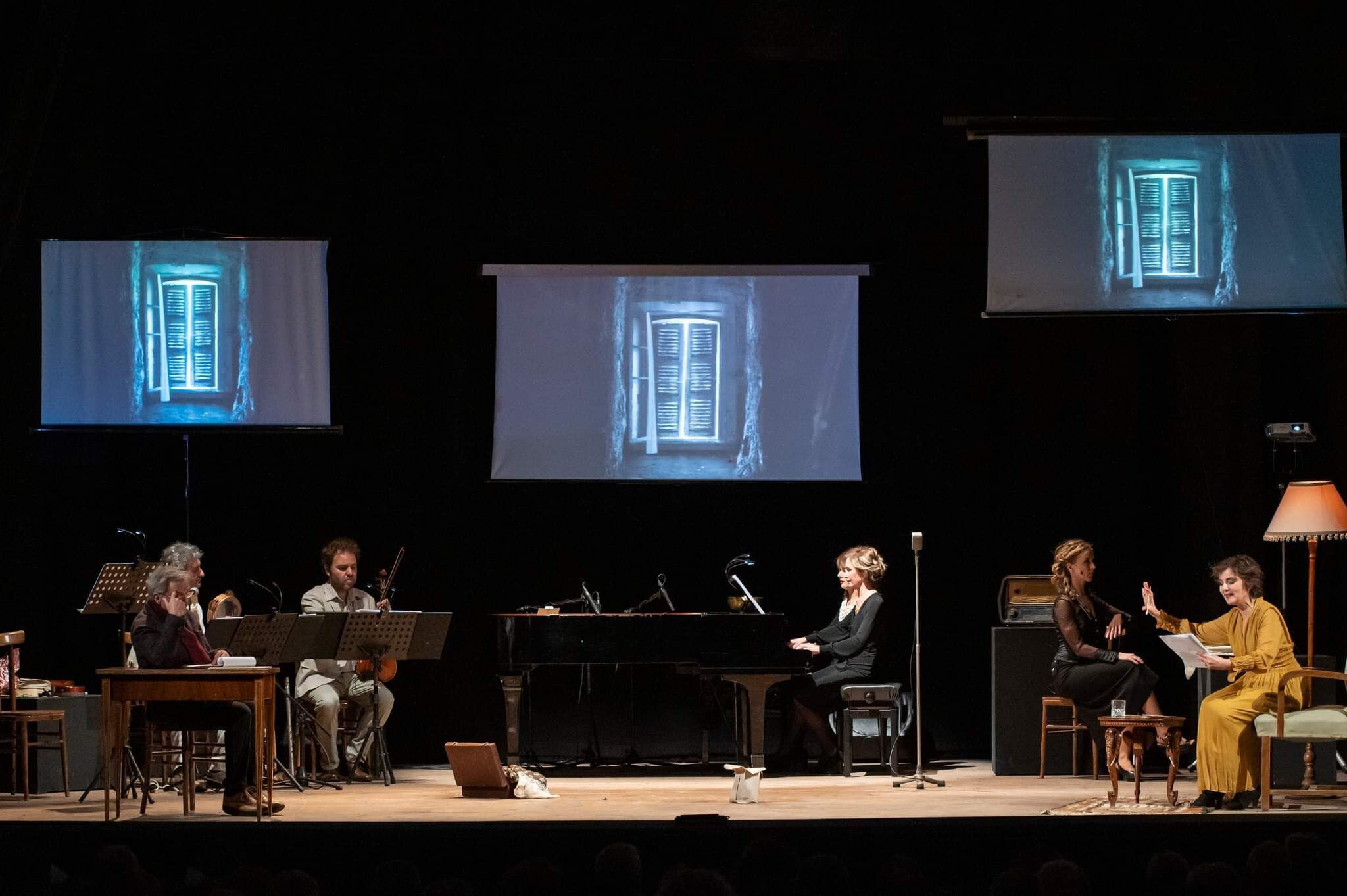 Molto originale e composito lo spettacolo di teatro musicale ha la drammaturgia di Mariza D’Anna e Guido Barbieri, musicologo e voce di Radio 3, la regia di Maria Paola Viano, le musiche originali di Carla Magnan e Carla Rebora. Sul palco ottimo musicisti: il duo pianistico di fama internazionale Paola Biondi e Debora Brunialti, la viola di Paolo Fumagalli, i fiati e le percussioni Edmondo Romano, e tre piani narrativi: la voce lirica della soprano serba Ana Spasic, la voce narrante (storica) di Guido Barbieri e quella recitante della brava e intensa attrice romana Clara Galante. Con le musiche dell’epoca riadattate, i video ben costruiti della storia degli italiani in Libia dal 1928, la storia si dipana con eleganza e grandi emozioni. Nell’azione scenica vibrante di suoni, immagini e sonorità dell’altrove, Clara Galante (Mariza D’Anna) scrive e racconta alla figlia Alexandra la sua infanzia felice trascorsa in Libia, ai giochi con i bambini arabi e inglesi, la scuola multilingue, le feste e i giorni spensierati passati nella tenuta agricola di 1.300 ettari del nonno Carlo e prima del bisnonno Francesco a Biar Miggi, località vicino al sito archeologico di Leptis Magna.