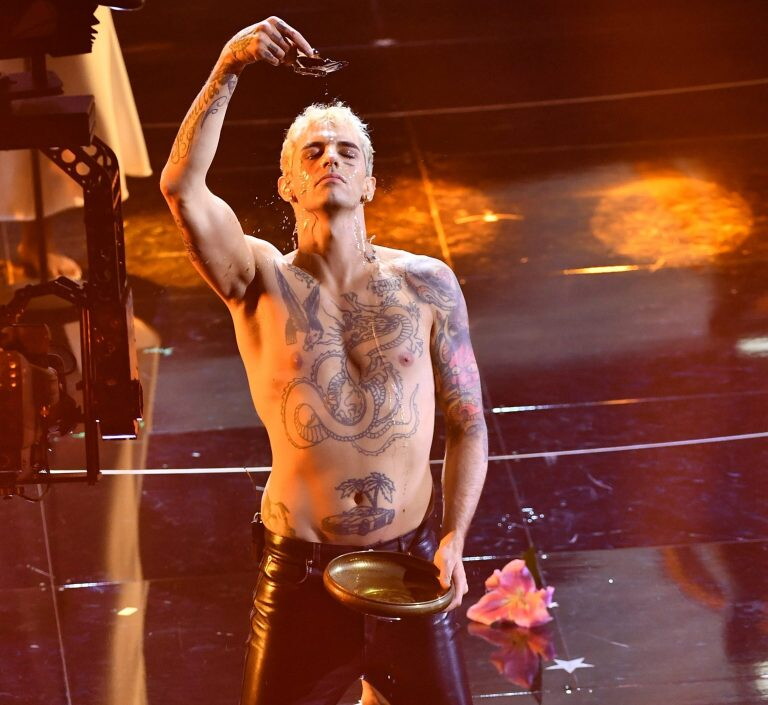 A torso nudo, indossando i suoi tatuaggi e i muscoli, scalzo, pantaloni di pelle nera,  Achille Lauro arriva sul palco dell’Ariston per aprire la gara dei Big con la sua "Domenica" insieme all’Harlem Gospel Choir.  «Mi metto accanto a lui - scherza Amadeus - perché in questo momento fa audience».  La solita mossa della carezza ai genitali pseudo provocatoria (ancora?!) accompagna un brano ballabile e con il grande soul  del Coro americano. Sul finale - sempre in cerca del gesto dissacrante - inscena un autobattesimo facendosi cadere dell’acqua da una grande conchiglia sul volto.