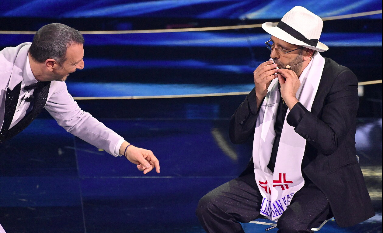 «Questa variante segnerà la fine della pandemia, è d’accordo?», gli chiede Amadeus. «Chiedi se un virologo è d’accordo con un altro virologo? Vuol dire non capire un cazzo di virologia. Purtroppo - sottolinea - la pandemia sta per finire, è brutto pure per te, perché secondo te alle 8 quando finisce la pandemia la gente guarda quella cazzata dei Soliti ignoti? Non ti prende più neanche Tele Cellino». Poi canta 'Pandemia ora che vai via», firmata da tutti i virologi, da Brusaferro a Burioni, da Pregliasco a Rezza e a dirigere l’orchestra c'è "Beppe Virussicchio».