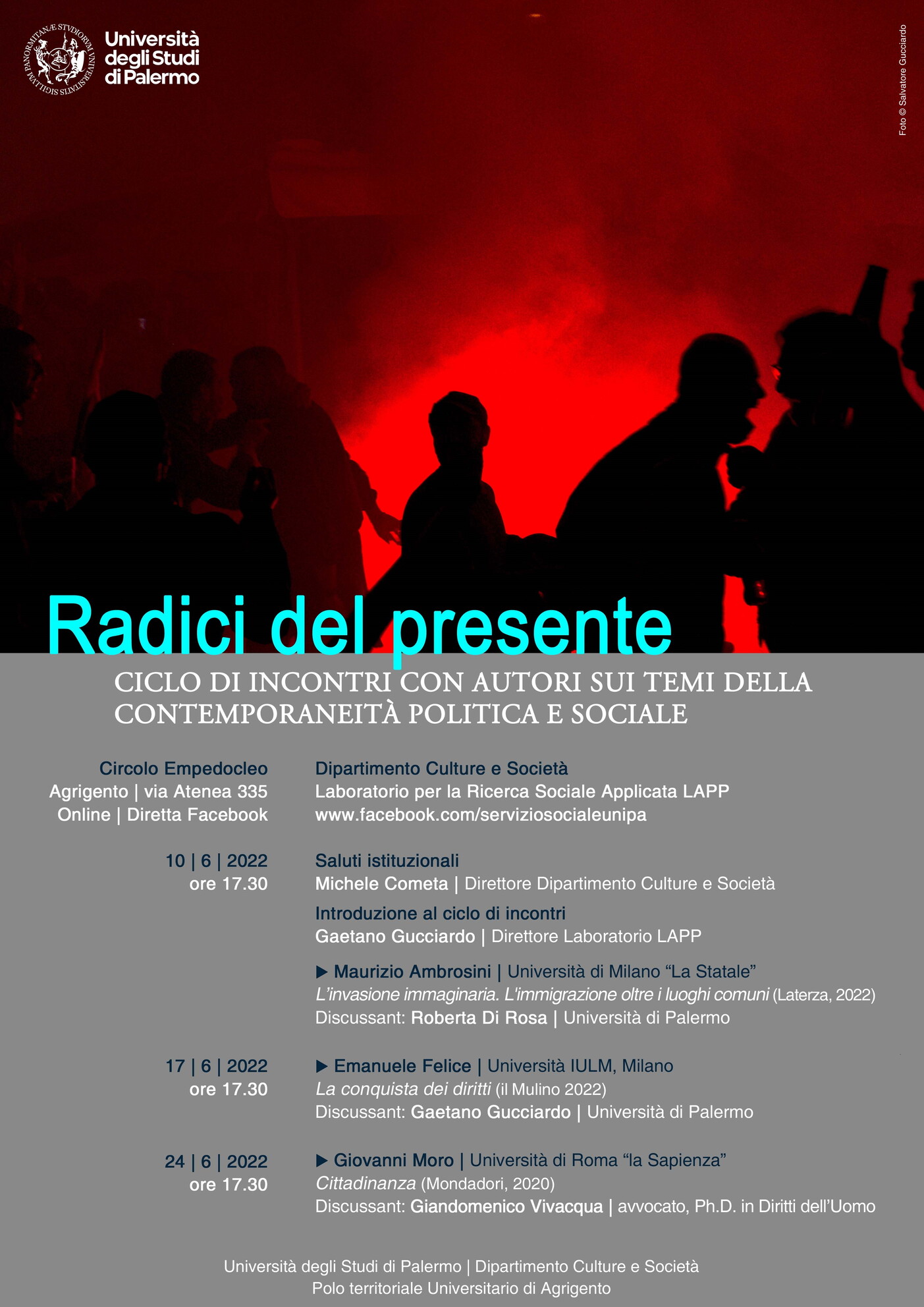 Dal 10 al 24 giugno, nell'ambito delle attività del Laboratorio per la Ricerca Sociale Applicata – LAPP, dell’Università di Palermo, il Dipartimento Culture e Società propone un ciclo di incontri con autori sui temi della contemporaneità politica e sociale dal titolo "Radici del presente".