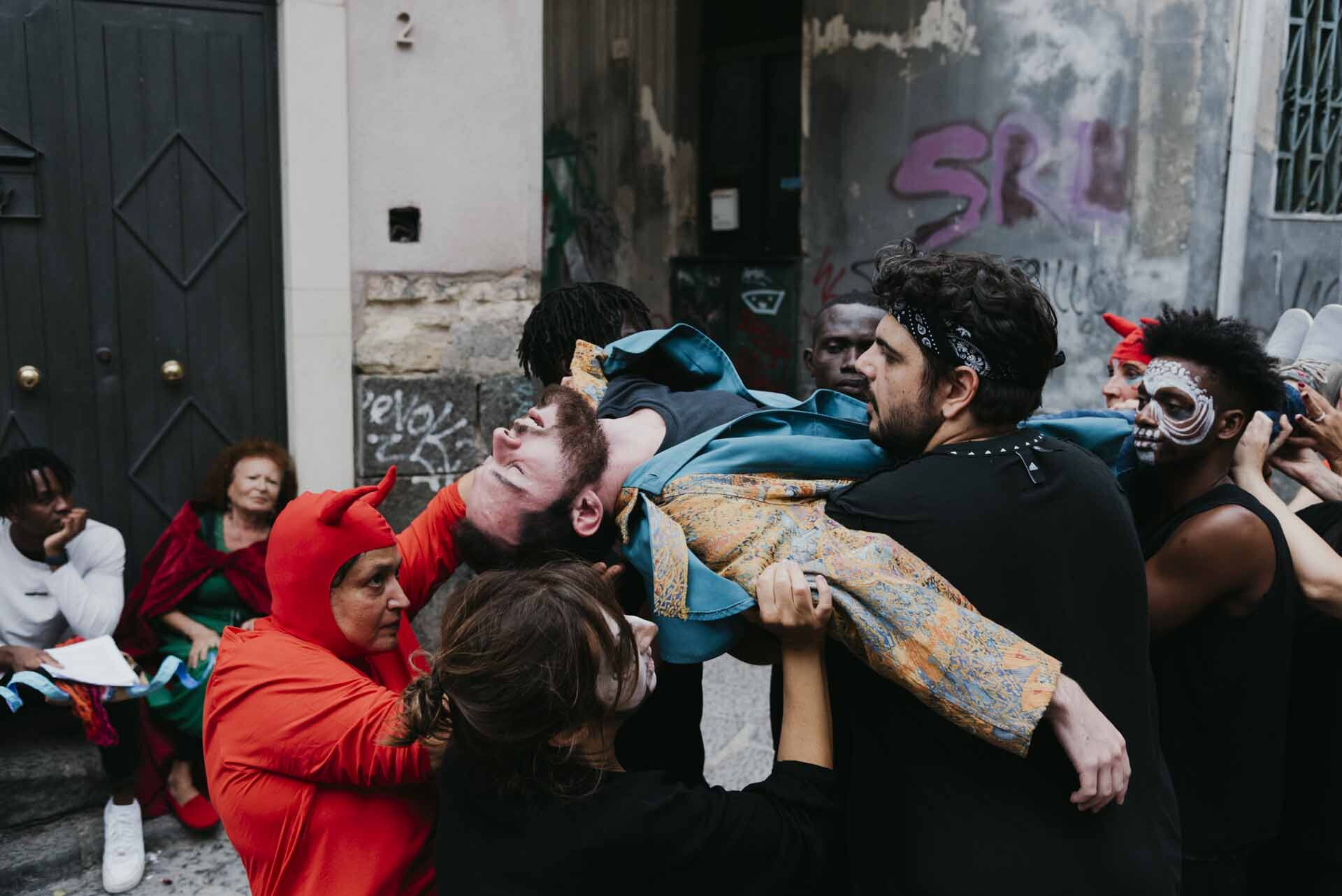 Mentre tra le case dirupate dei vicoli di San Berillo sfila il corteo che segue il fercolo, i personaggi mutano, indossando primitive maschere di demoni e animali, il marchio magico delle energie ancestrali che influenzano nel profondo la vita sociale». Un corteo che si trasforma in una scatenata taranta, ed è formato, oltre che dagli attori - Luana Toscano (Filomena la narratrice), Antonella Scornavacca (la Santa), Elmo Ler (Calandrino), Loriana Rosto (Lisabetta da Messina), Ibrahima Diallo (il Diavolo), Daniele Triolo (Lorenzo), Claudia Bono (lettrice di tarocchi)- anche dall’Orchestra d’armonia della Contea, da un coro di cinque elementi, il Secret Chord, e da una decina di migranti del Centro Astalli.