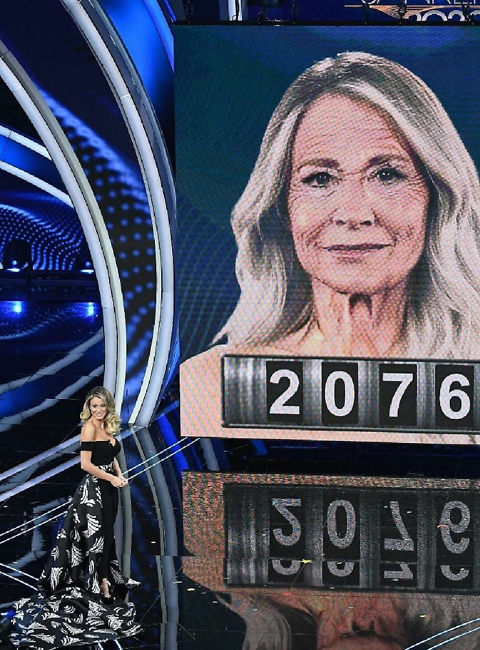 Poi sul maxi schermo appare una simulazione dell’invecchiamento della conduttrice televisiva, quando dovrebbe avere l’età di sua nonna, nel 2076.