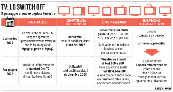 Il governo ha confermato che la cessione della banda 700 MHz alla telefonia resta fissata per l’1 luglio 2022. L’attivazione del Dvbt-2 a livello nazionale, invece, sarà invece disposta a partire dal 1 gennaio 2023, e non più giugno 2022, «ritenendo necessario - spiega il ministero - un periodo più ampio per l'implementazione a regime del nuovo standard». Per verificare se il proprio schermo è compatibile con questo standard occorre sintonizzarsi sui due canali test 100 e 200: solo se appare il messaggio «Test HEVC Main10» il modello è abilitato alla ricezione.