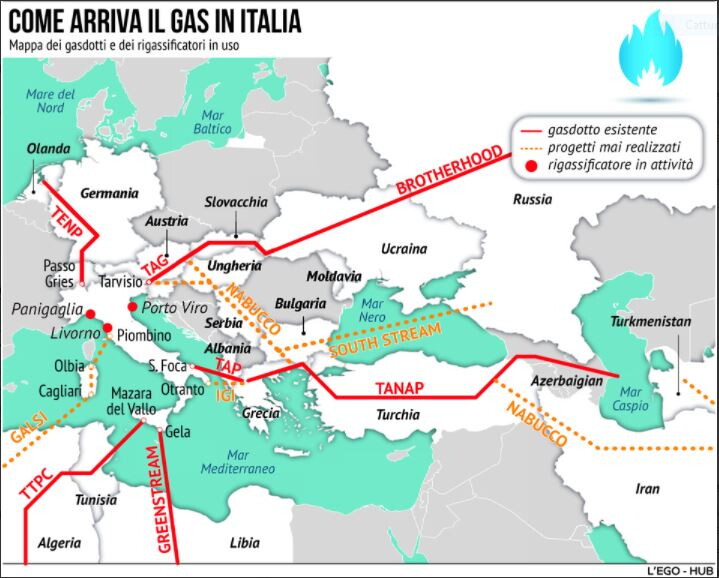 Per generare elettricità e alimentare cucine e impianti di riscaldamento, oggi l’Italia “brucia” 76,1 miliardi di Smetri cubi di gas all’anno, e di questi la metà arriva dalla Russia.